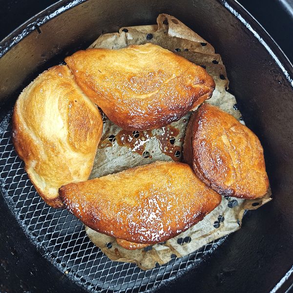 Nướng 200 độ C đến khi bánh nâu vàng là được. Ai dùng airfryer thì sau 10-13 phút, mở ra và trở mặt bánh để bánh chín vàng đều 2 mặt.