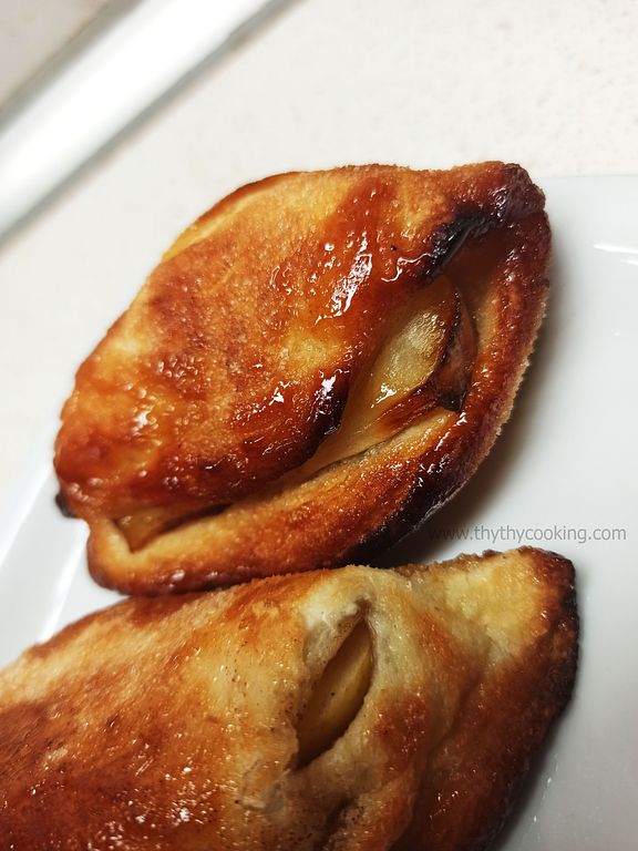 Cho táo lên vỏ bánh. cuộn vỏ bánh lại như hình, nhấn chặt mép bánh để bánh không bị bung ra khi nướng.