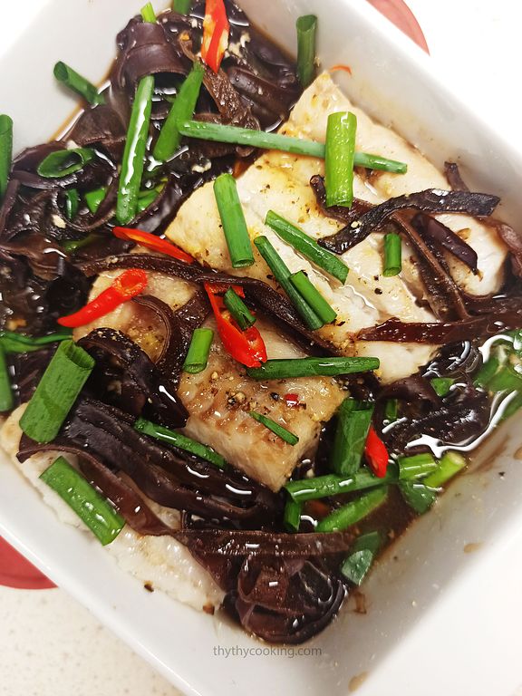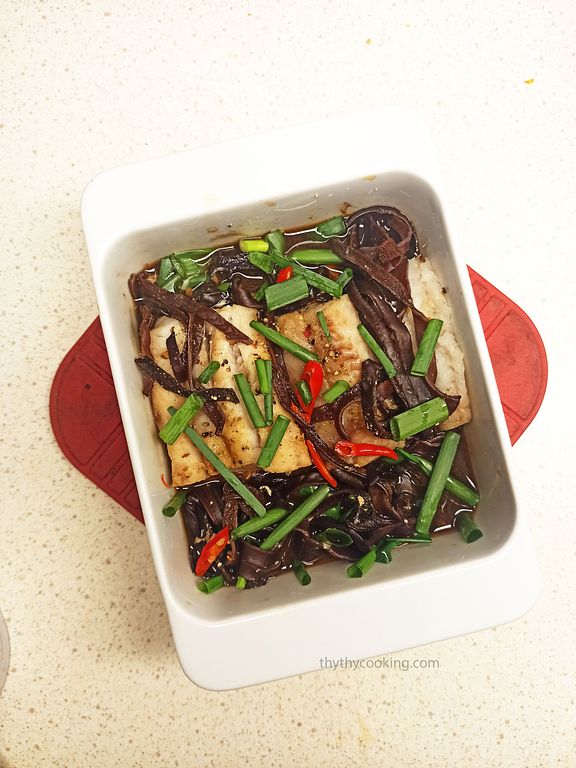 Hôm nay mình nấu món cá hấp tương, hành, gừng, ớt và nấm mèo. Nhẽ ra có cả miến nữa, nhưng nhà hết miến nên thôi, nhịn vậy. 😆