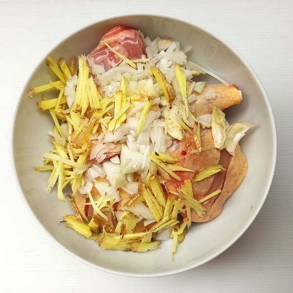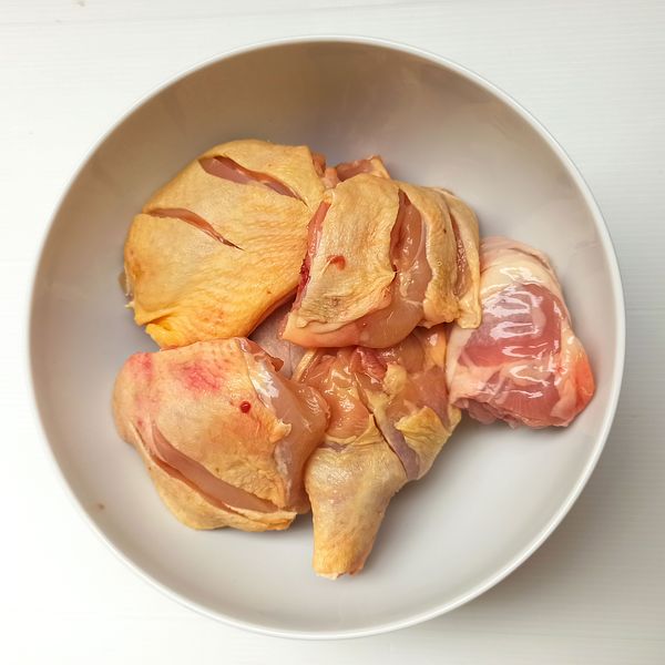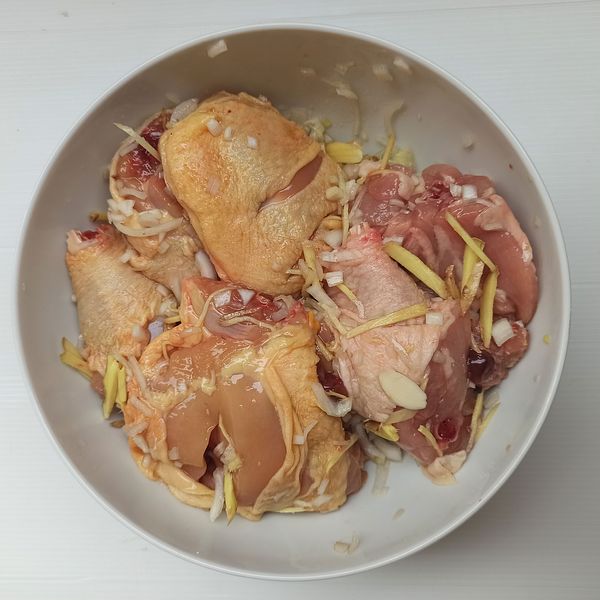 Thịt gà cắt miếng vừa ăn, mình nấu hơi Tây nên thịt cắt hơi to, mọi người ở VN ăn đũa có thể cắt nhỏ hơn. Mình tự chặt thịt ở nhà thì xương bé bé hay vỡ bể, khi nấu thi thoảng trúng 1 hạt xương nhỏ cũng thê thảm cho răng lắm! hic! Khứa vài khứa lên thịt gà nếu cắt miếng to cho ngấm gia vị. Nhưng khứa 1 nhát thôi vì sau khi nấu da ko còn căng mọng nên hơi giảm tính hấp dẫn cho món ăn 1 tý.