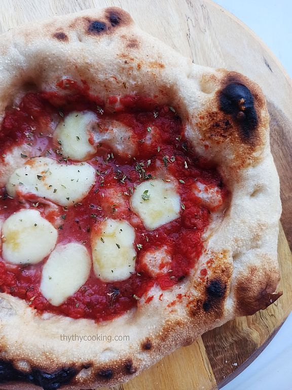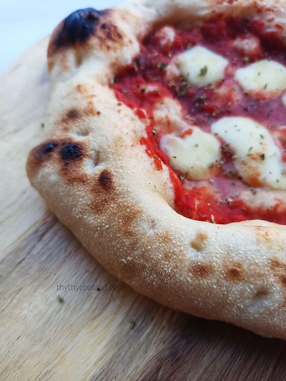 Preriscalda il forno alla massima temperatura. Io ho usato una macchina per pizza super calda, così l’impasto è gonfiato benissimo. Si è gonfiato così tanto che ha toccato la resistenza e si è bruciato 😂😂