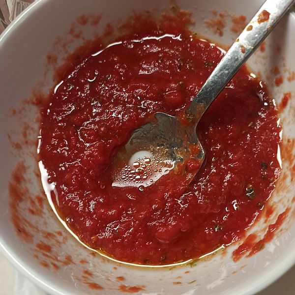 Nel frattempo, prepara la salsa di pomodoro mescolandola con sale, olio d’oliva e origano.