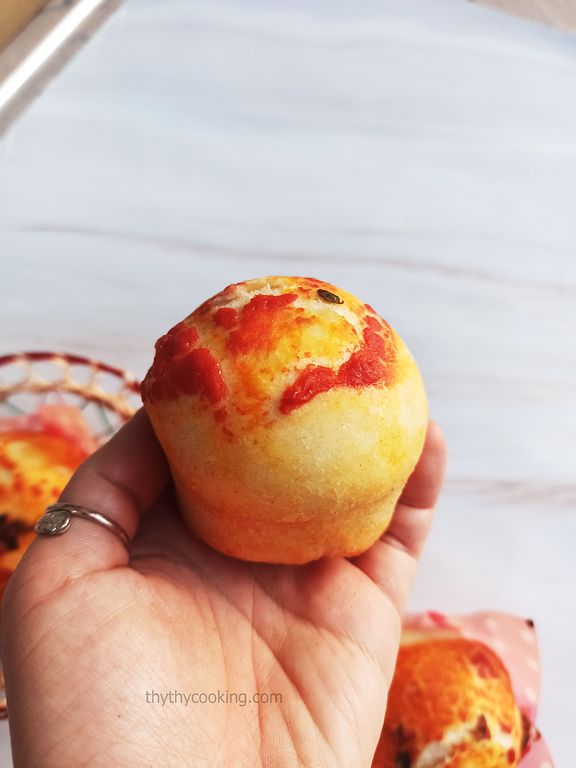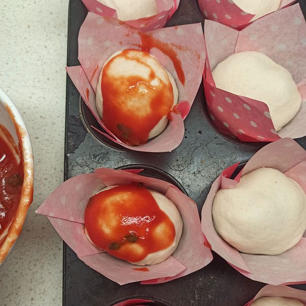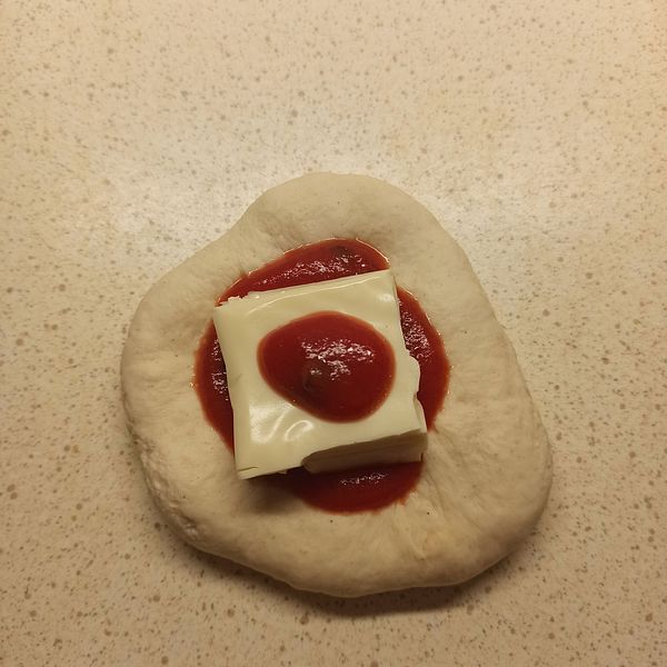Dùng tay có nhúng bột áo cho đỡ dính, nhấn vào trái banh làm cho nó dẹp dẹp 1 tý, hoặc có thể dùng đồ cán bột, cán cho trái banh khá mỏng, đủ để cho xíu sốt cà chua (nên cho ít thôi, trong hình mình cho nhiều quá), nhiều sốt cà chua thì gói bánh khó, và chẹp nhẹp).