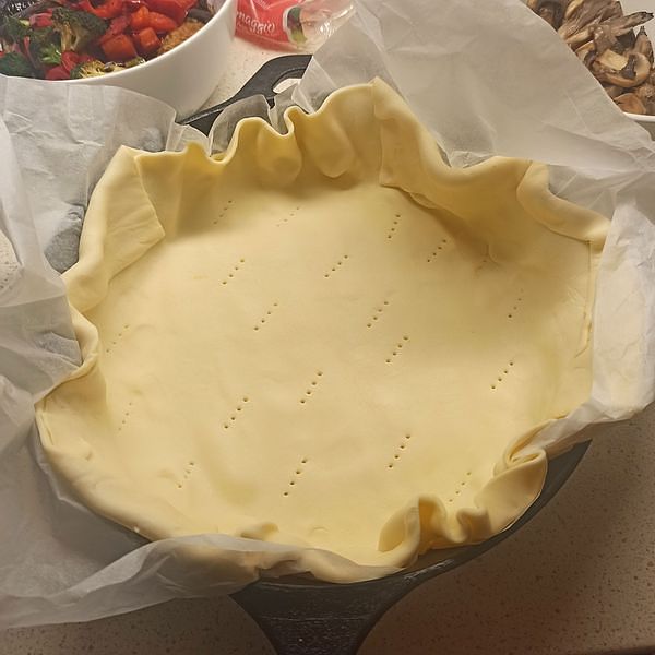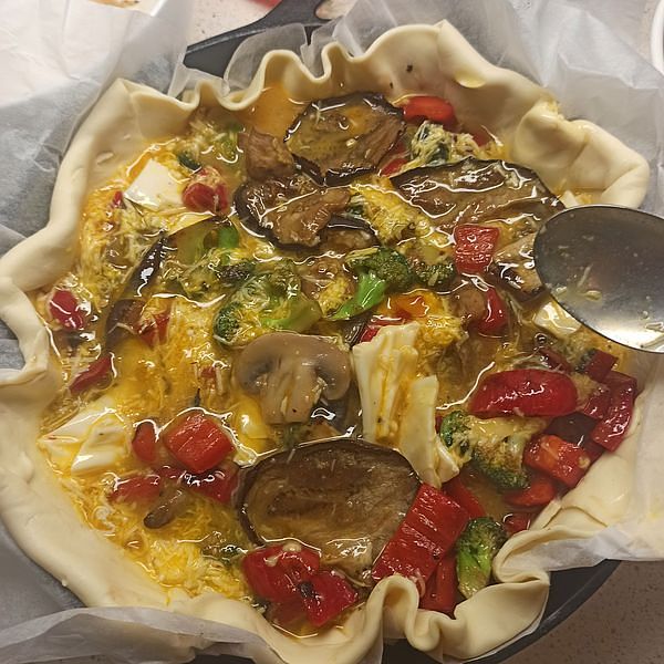 Pour the egg mixture over the pastry, using a spoon to gently adjust the vegetables so the eggs spread evenly across the base.