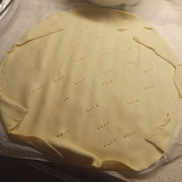 Place the puff pastry on the tray and prick it with a fork to prevent the base from puffing up during baking.