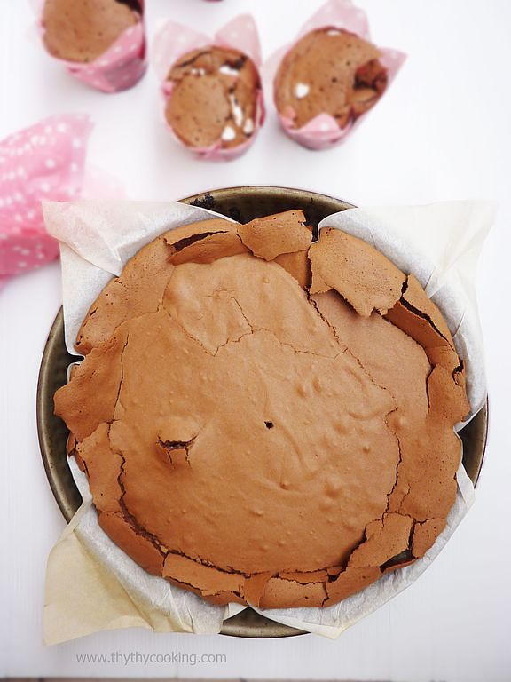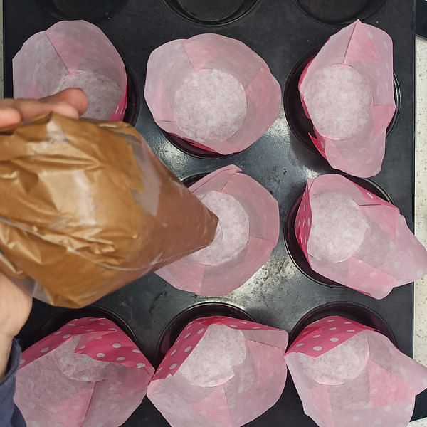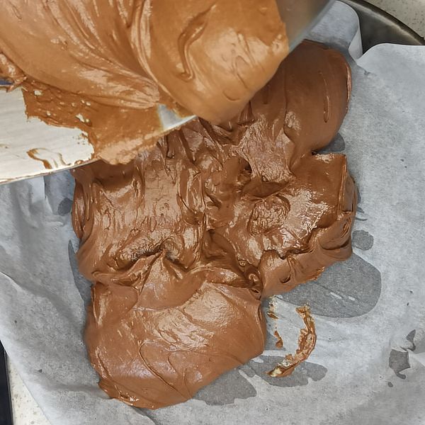 Pour the batter into a pan lined with non-stick baking paper. The cake should be about 3 cm thick. Any leftover batter can be poured into cupcake molds for easier transport, especially for children to bring to school.