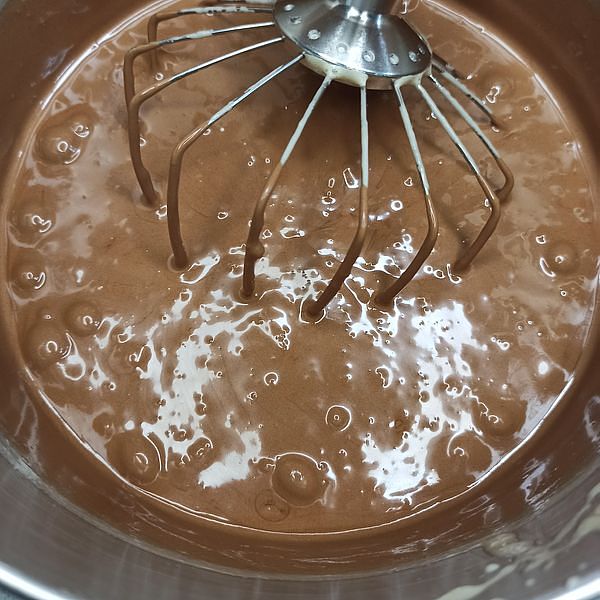 Sift the flour into the chocolate mixture, dividing it into 3 parts. After sifting each portion, use a hand whisk to stir in a circular motion from top to bottom as shown in the image. Once all the flour is mixed in, the batter will be fluffy.