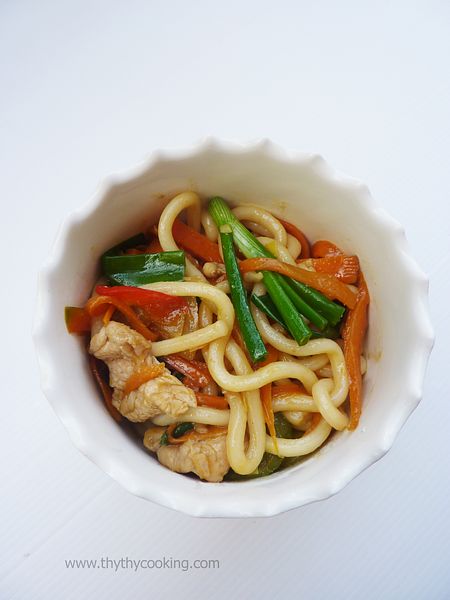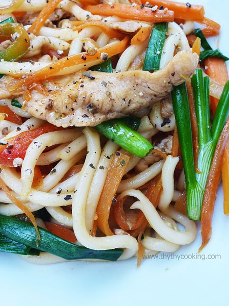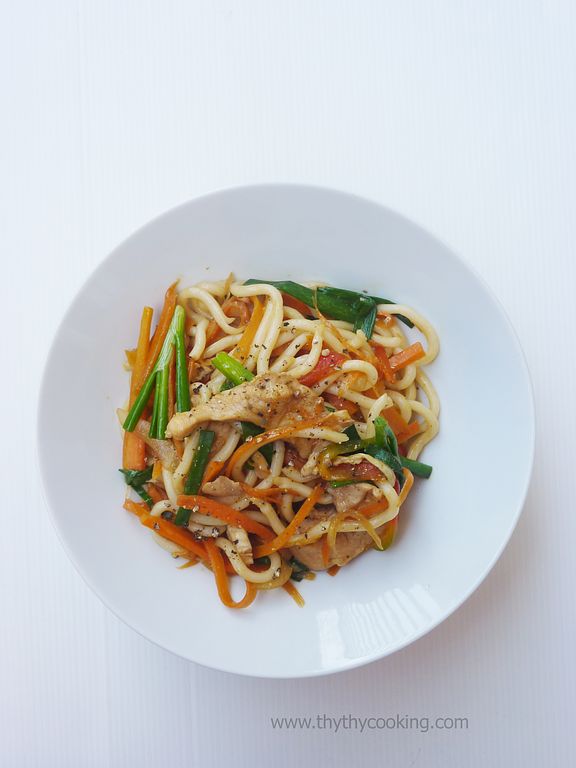 Nêm nước tương, dầu hào, muối. Xào đều tay tới khi thịt và rau củ vừa chín tới là cho phần Udon đã ráo nước vào, xới cho thấm đều gia vị