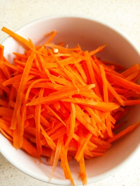 Gọt vỏ cà rốt, cắt sợi, mình có cái đồ bào sợi nên bào cho nhanh như Video.