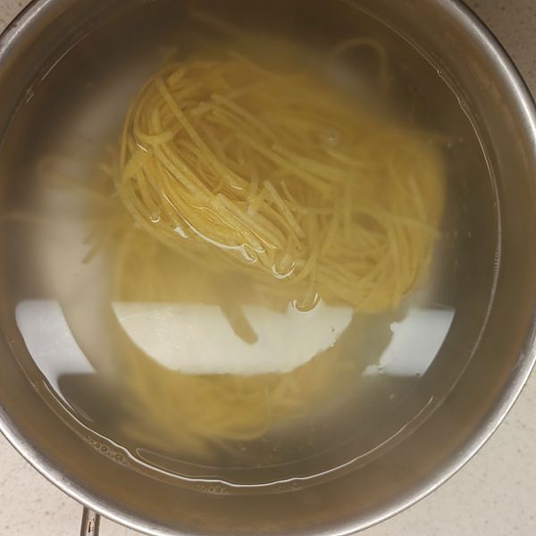 Bring a pot of water to a boil. Once boiling, add salt and cook the pasta according to the time indicated on the package.