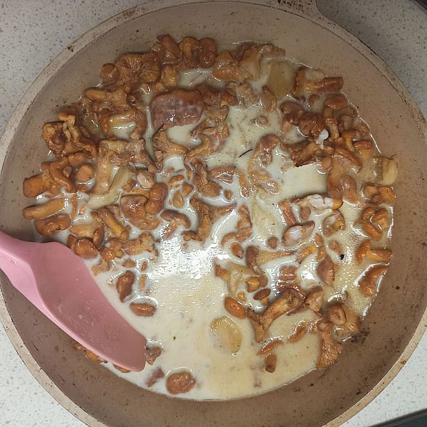 Pour the milk mixture into the mushrooms. Cook for 1 minute until the sauce thickens, then turn off the heat.