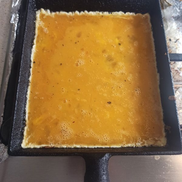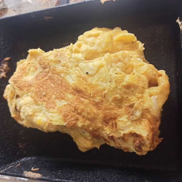 Chiên trứng trên chảo, vừa chiên vừa khuấy cho trứng mau chín, cuộn trứng lại, không cần đẹp