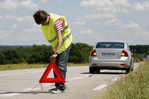 Phải mặc áo bảo hộ phát sáng như vầy nè để mọi người biết mình là chủ và đặc biệt nếu trời tối thì người ta thấy mình. Phải mặc vì như ông sinh viên nhà mình, phải xuống đường điều tắc giao thông, tránh ùn tắc. Đặt biển báo hỉnh như 3 hay 5 mét cách xe mình để xe khác biết đường mà đi chậm, tránh đâm vào xe mình. Áo và biển báo luôn luôn phải có trong xe. Luật á!